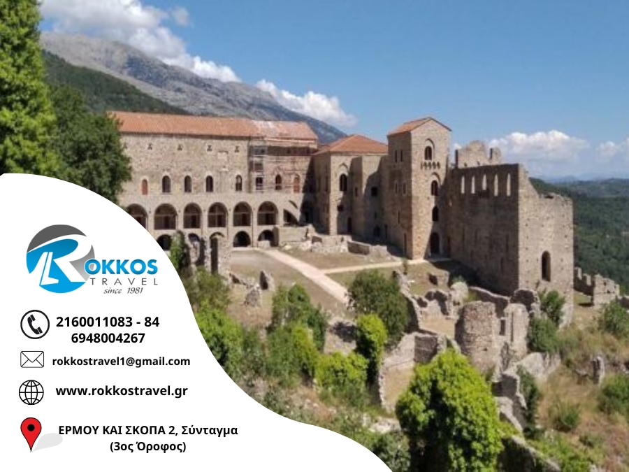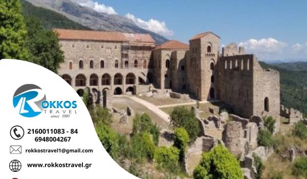 Αναχώρηση στις 07:00 από Πειραιά και στις 07:30 από Αθήνα (Σύνταγμα). Ο βυζαντινός Μυστράς, το καλύτερα διατηρημένο παράδειγμα μεσαιωνικής πόλης με τείχη στην Ελληνική επικράτεια, είναι σήμερα μια μόνιμη πόλη-φάντασμα που συναρπάζει τον σύγχρονο ταξιδιώτη με το κάστρο, τις εκκλησίες και το ανακτορικό σύμπλεγμα της κυρίαρχης βυζαντινής δυναστείας, μαρτυρώντας το παρελθόν του. Θα περιπλανηθούμε στην πόλη του κάστρου και θα δουμε το Παλάτι των Δεσποτών, τα σπίτια των Λάσκαρης και του Φραγκοπούλου, τον όμορφο Καθεδρικό Ναό του Αγίου Δημητρίου και τα εντυπωσιακά Μοναστήρια της Παναγίας Παντάνασσας και της Παναγίας Περίβλεπτου. Τα μνημεία της περιοχής μένουν σιωπηλά και έχουν ιστορίες για να πουν πέρα από τη φαντασία, για απαγορευμένες βεντέτες μεταξύ οικογενειών, αλλά και παραμυθιών και θρύλων της παλιάς εποχής, καθώς και τη μακρά ιστορία των πολέμων που ακολούθησαν και τους εναλλασσόμενους κατακτητές. Θα ξεκινήσουμε από την επάνω πύλη και η διαδρομή που θα ακολουθήσουμε οδηγεί ομαλά προς τα κάτω στην πύλη εξόδου.